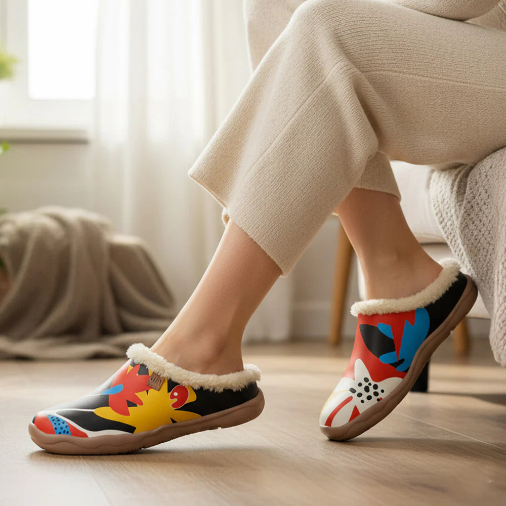 厚くした柔らかいフェイクカシミア裏地は足を暖かくし、室内も室外も着用可能、人目を惹きつける柄とフリースで注目を集められる。