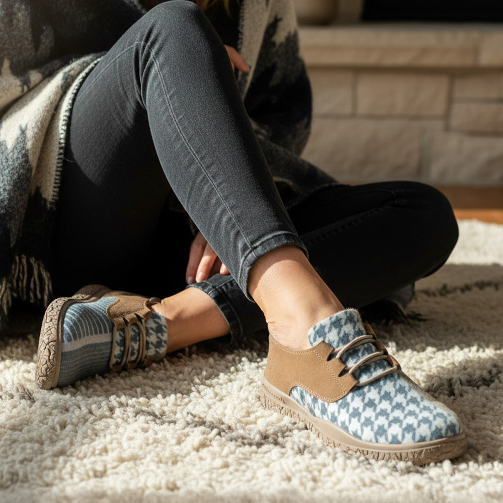 足型のデザインとゆったりしたつま先が素足でも快適で、足の指を自然に広げる。